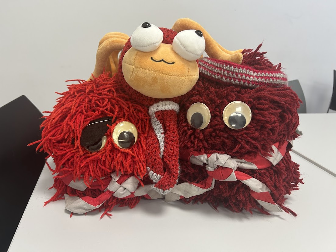 We also have another un-stealable mascot, Sally the Seahorse (she/her, pictured on the left); who’s so important that she got her club necker before anyone else! She was our stealable mascot up until Christmas 2024, when she was retired due to old age and the inability to cope with the trauma of being stolen at LOTRR.