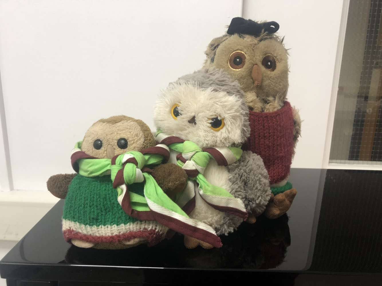 Olivia Kings - A larger brown fluffy owl with a burgundy and green jumper on - Unstealable - Held by the Treasurer - Right