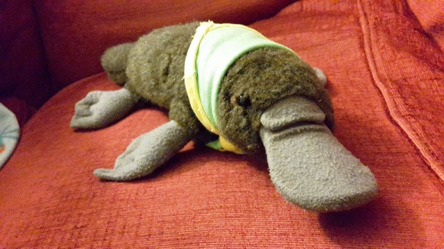 Current Mascot (stealable, pictured): Whimsy - a small duck with a very fetching 'bum hat'. Whimsy attends the majority of our meetings and lives with our chair.