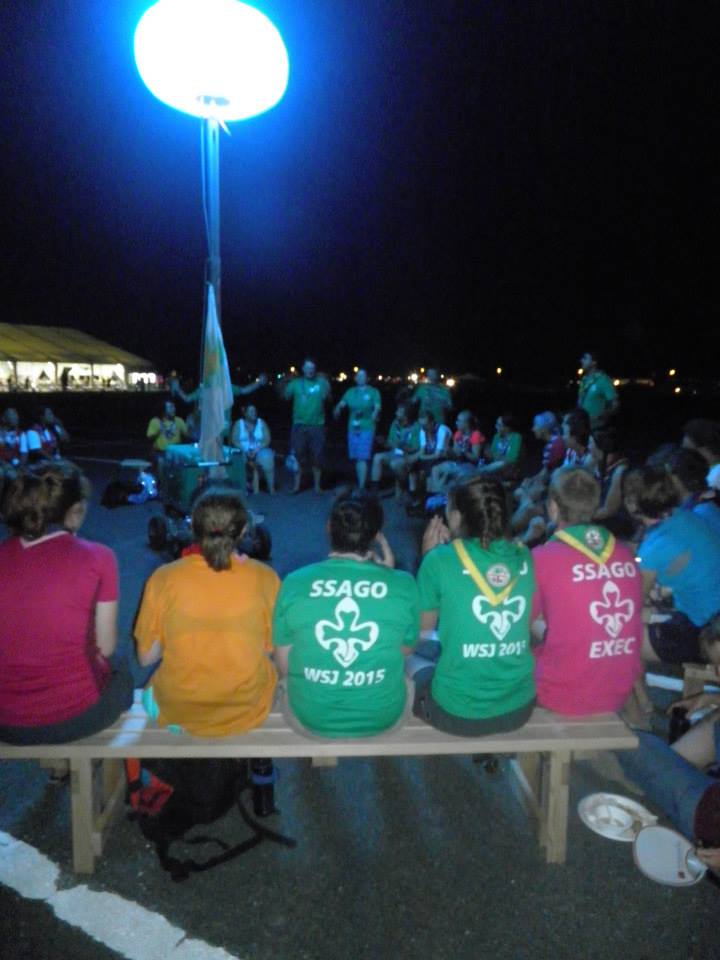 With so many SSAGO members in Japan some kind of meet up was definitely called for. A campfire was therefore planned one night, and not even the complete absence of any fire was enough to deter SSAGO!We set ourselves up around a handy spotlight, and hoisted the SSAGO flag. The singing was a mix of traditional SSAGO songs, along with some new ones from our international friends. Scouts that attended found it funny and welcoming, and thought that the impromptu nature of it matched the Jamboree setting.